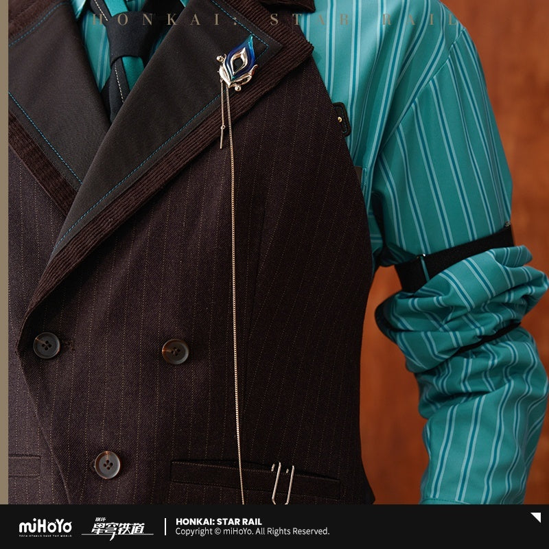 Sophisticated with a calculated edge, this brooch channels Aventurine’s signature charm. Crafted with emerald inlays, golden dice motifs, and sleek, angular lines, it adds a touch of high-stakes elegance to any outfit. A subtle nod to the strategist who always dresses like he’s already won.