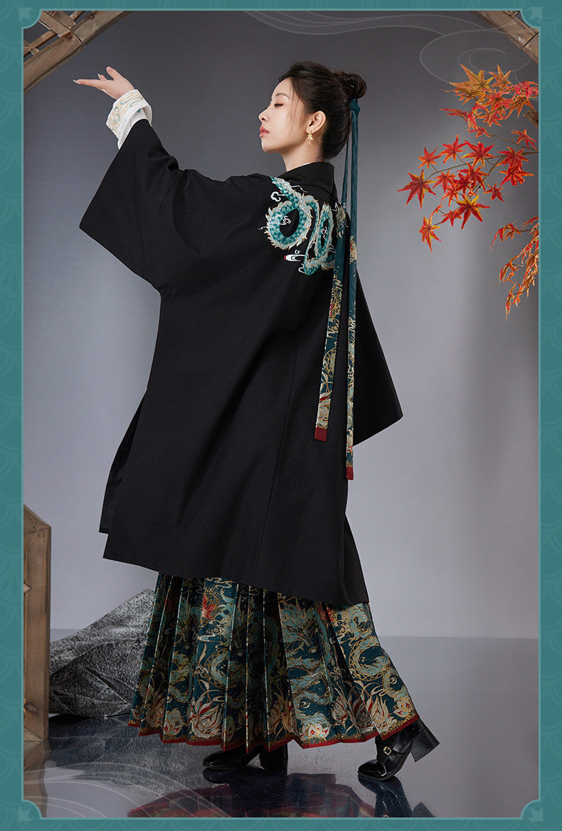 A celestial look inspired by Imbibitor Lunae Dan Heng — flowing layers in deep teal, jade, and silver, with draconic embroidery running along a high-slit outer robe. Fitted inner garments echo the Vidyadhara lineage, blending martial precision with mythic elegance. Ornamental accents and scale-like textures pay homage to the Azure Dragon’s legacy — graceful, reserved, and untouchably powerful.