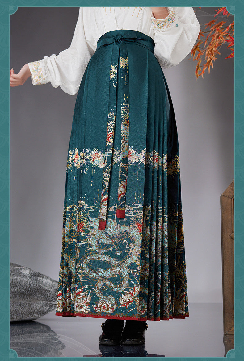 This Mamian Skirt Wrap, from the Dan Heng • Imbibitor Lunae collection, reimagines tradition with celestial flair. Featuring flowing emerald panels, golden embroidery of clouds and dragons, and a structured wrap silhouette, it evokes the ancient elegance of the Vidyadhara race.