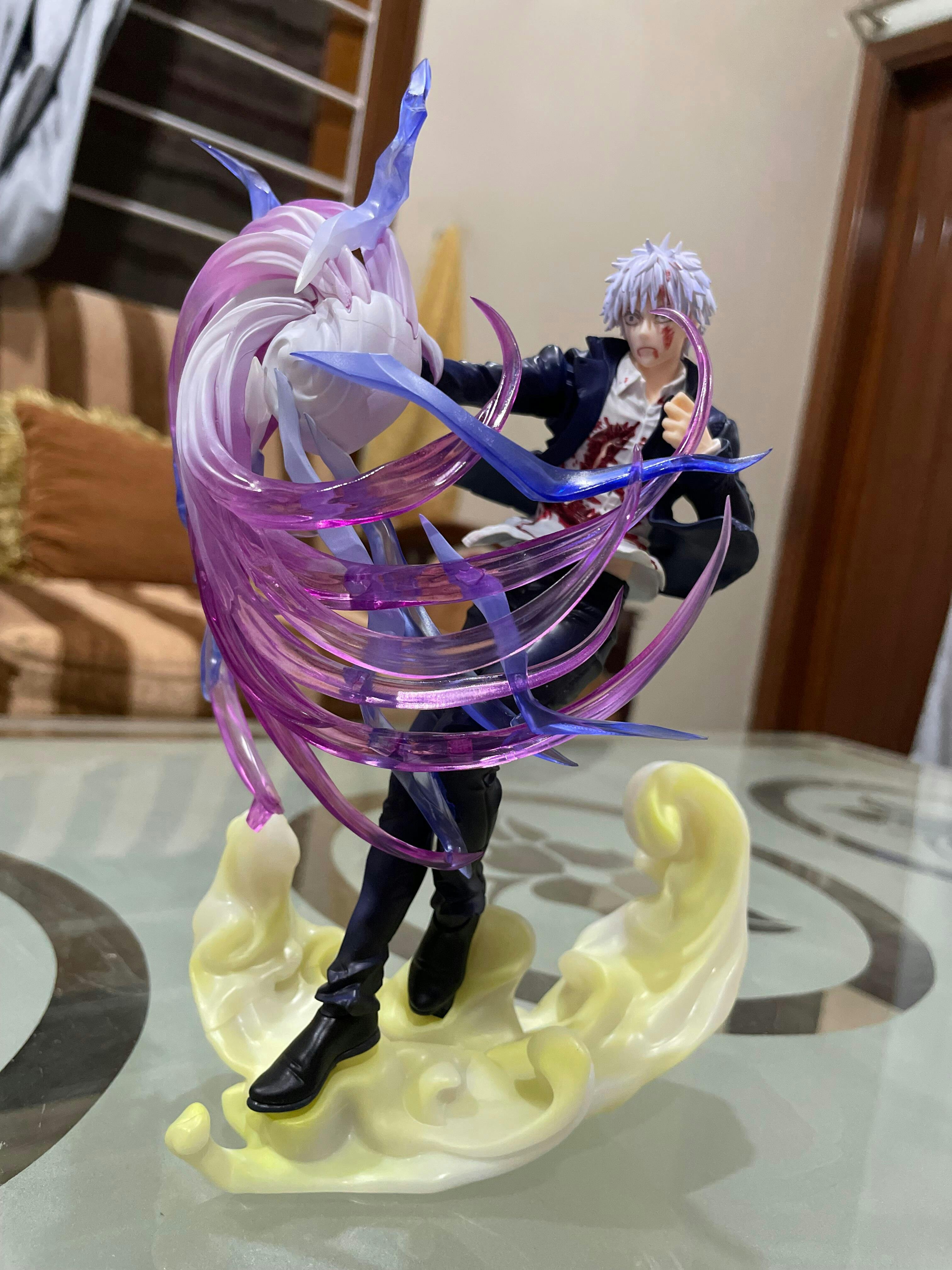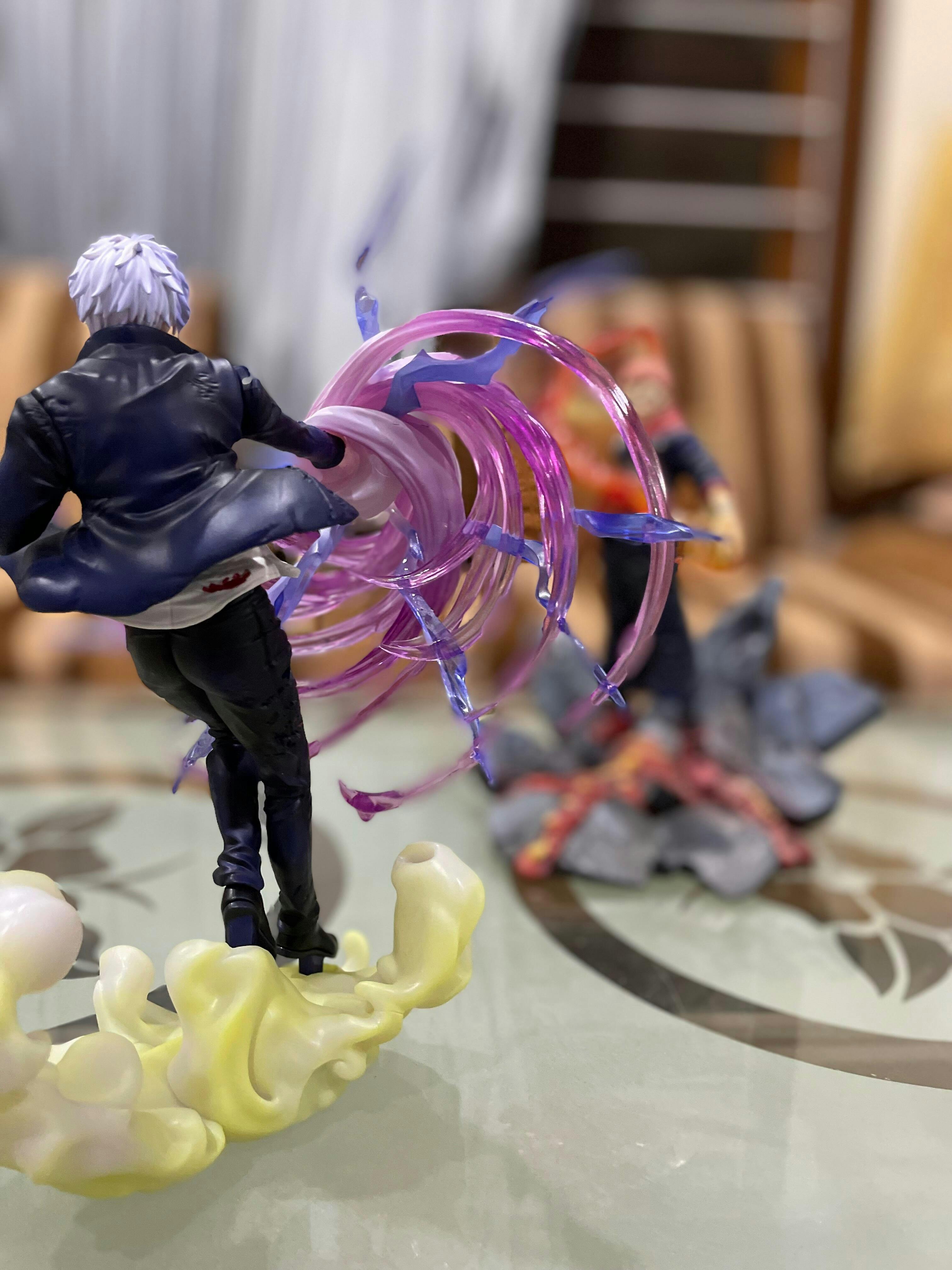 This figure looks stunning with its dynamic pose and swirling energy effects. The details—like the bloodstained shirt and intense expression—add a gritty, powerful vibe. The translucent purple effects and cloudy base make it a real eye-catcher. A top-tier piece for any anime fan or collector!
